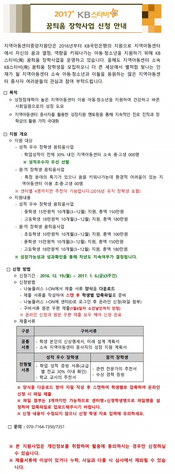 [홍보]KB스타비(飛) 꿈틔움 장학사업 2017년 상반기 신규 장학생 모집