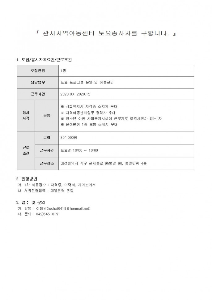 관저지역아동센터 토요종사자 채용 공고