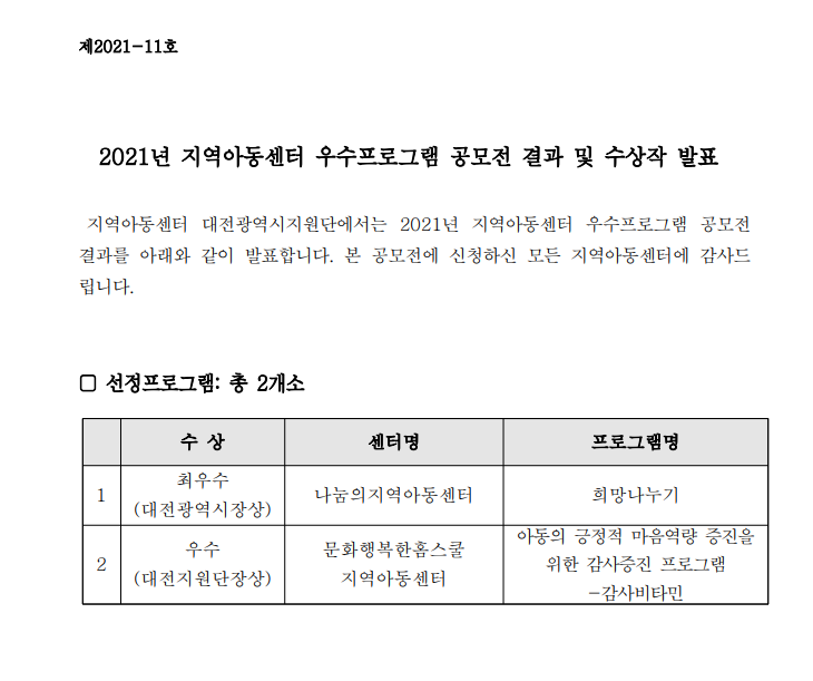 [공지] 2021년 지역아동센터 우수 프로그램 공모전…