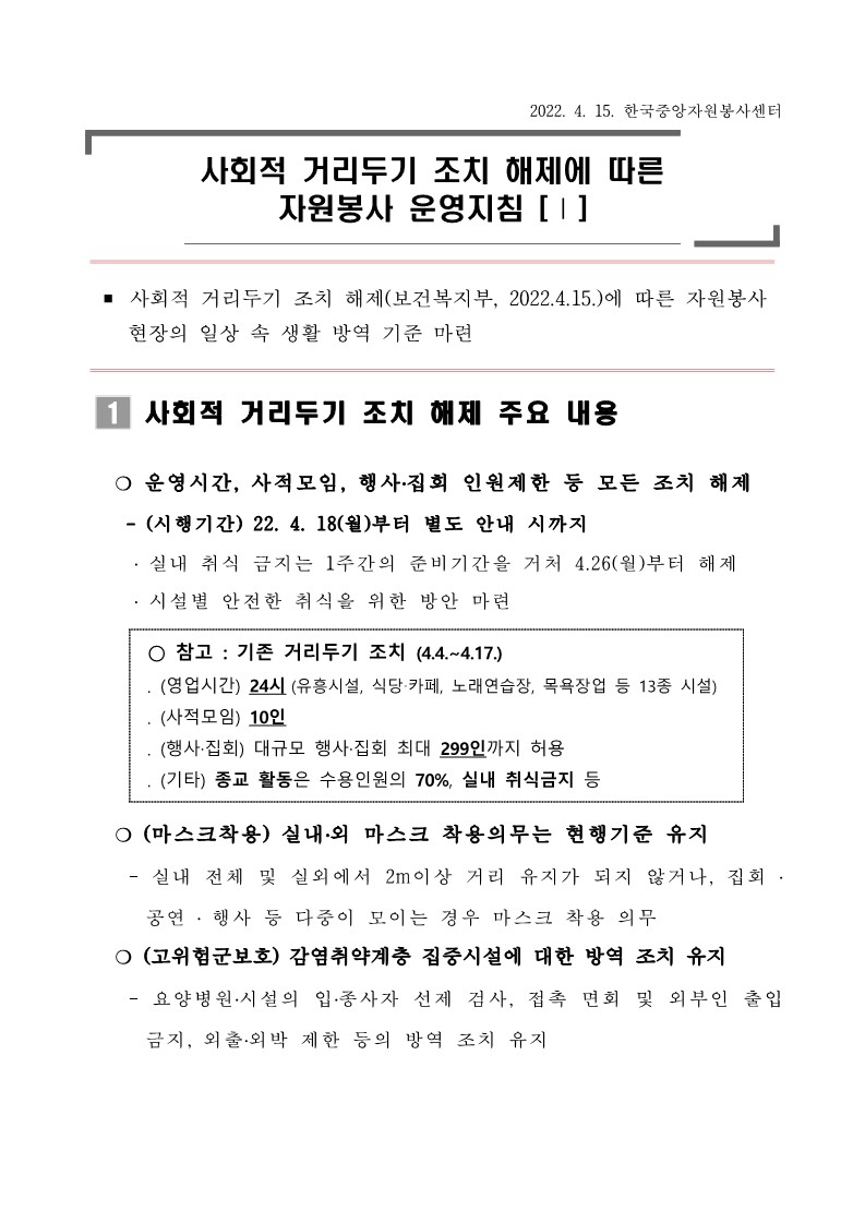 사회적 거리두기 조치 해제(보건복지부, 22.4.15)에 따라 자원봉사현장의 일상방역기준 마련을 위한