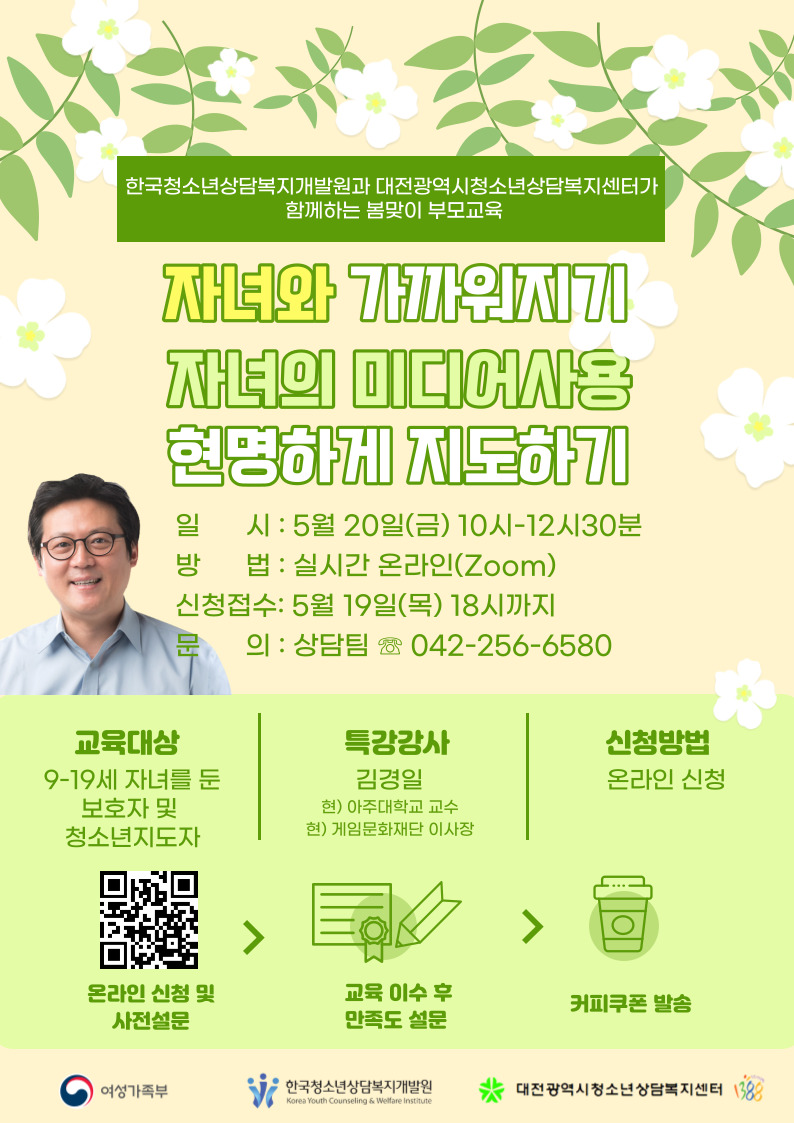 대전광역시청소년상담복지센터에서 주관하는 부모교육 신청을 안내드리오니,