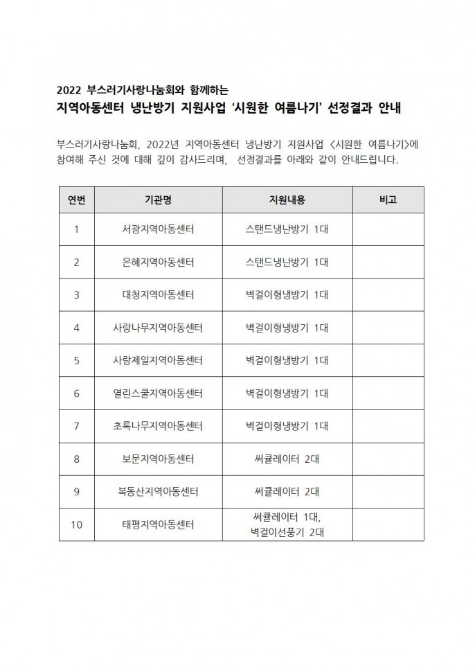 2022 부스러기사랑나눔회 냉난방기 지원사업…