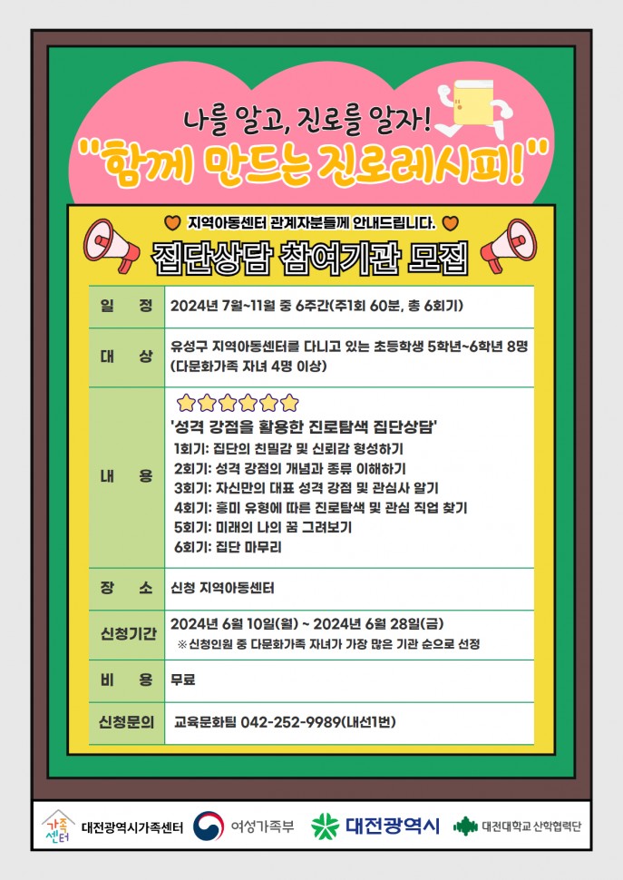 대전광역시가족센터에서 진행하는 2024년 다채움 찾아가는 집단상담 프로그램을 아래와 같이 안내하오니 센터의 참여 바랍니다.