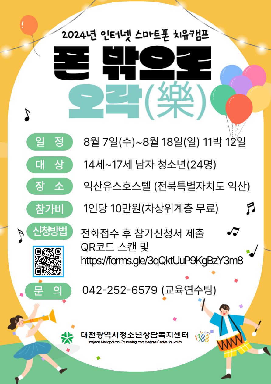 대전광역시청소년상담복지센터에서 진행하는 2024년 청소년 인터넷·스마트폰 치유캠프 참가자를 아래와 같이 모집하오니 관심있는 센터의 신청 바랍니다.