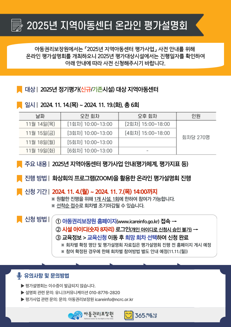아동권리보장원에서 2025년 지역아동센터 평가사업 사전 안내를 위해 [2025년 지역아동센터 평가설명회]를 개최하오니