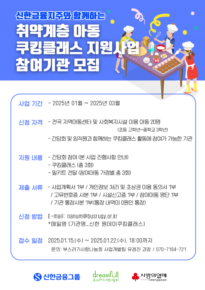 부스러기사랑나눔회에서 신한금융그룹과 함께하는 원데이 쿠킹클래스 지원사업의 참여기관을 아래와 같이 모집하오니 많은 관심과 신청 바랍니다.