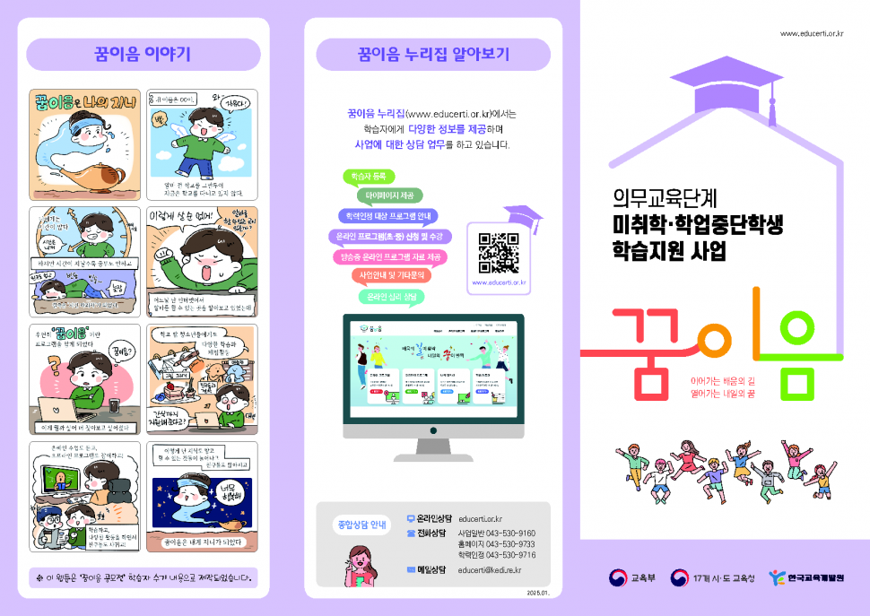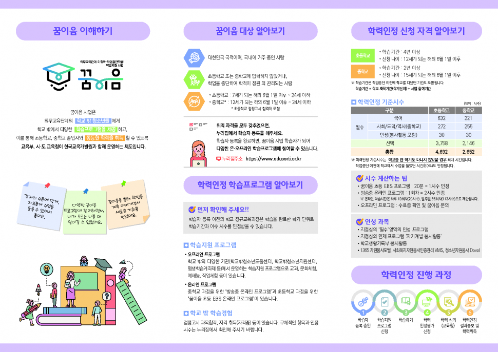 교육부, 시·도 교육청이 한국교육개발원과 운영하는 꿈이음 사업은 의무교육단계의 학교 밖 청소년들에게 학교 밖에서 다양한 학습프로그램을 제공하고, 이를 통해 초등학교, 중학교 졸업자와 동등한 학력을 취득 할 수 있도록 하는 제도입니다.