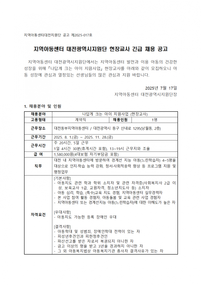 [공지] [채용] 나답게 크는 아이 지원사업 현장교사…