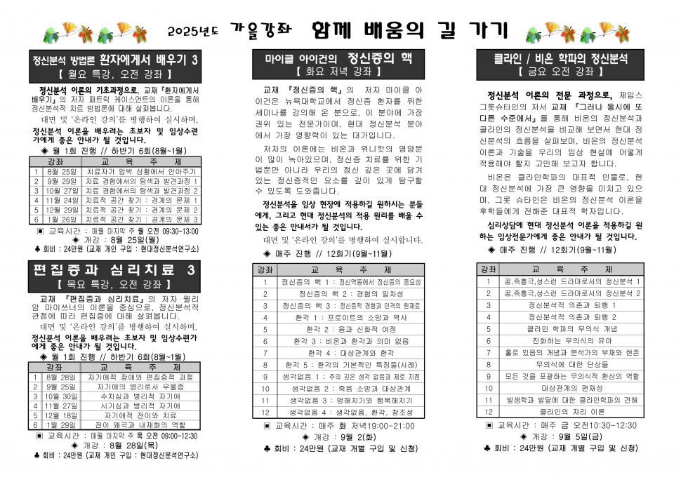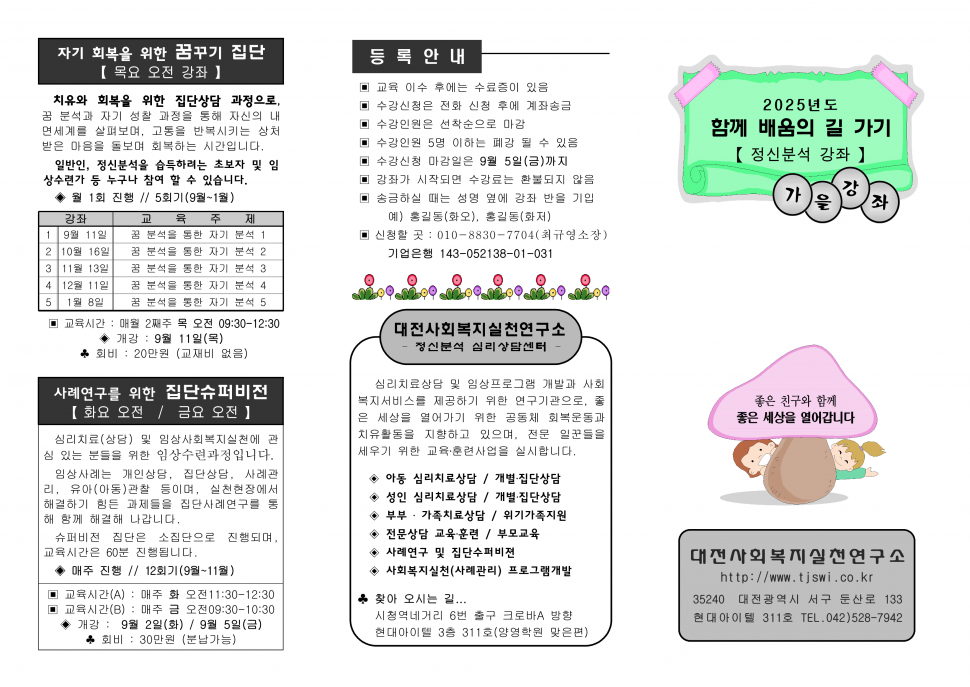 대전사회복지실천연구소에서 "2025년 가을학기 정신분석 강좌-함께 배움의 길 가기"를 개강합니다.
